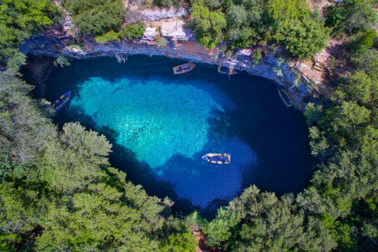 Melissani Cave is certainly one of Kefalonia’s most enchanting natural wonders. The underground lake’s crystalline blue waters and breathtaking rays of light filtering through the opening in the cave’s roof create a dreamy feel. A short boat ride inside will show you the spectacular rock formations and the interesting play of light and shadow.